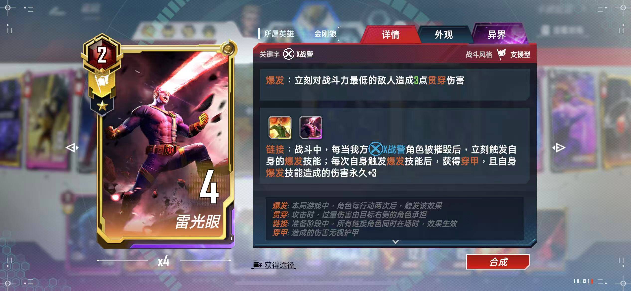 凤凰两个链接都要开:和镭射眼的亡语爆发,和脚斗士的战斗开始获得凤凰之力。镭射眼也必须开,凤凰死亡直接触发爆发+遭遇连射。