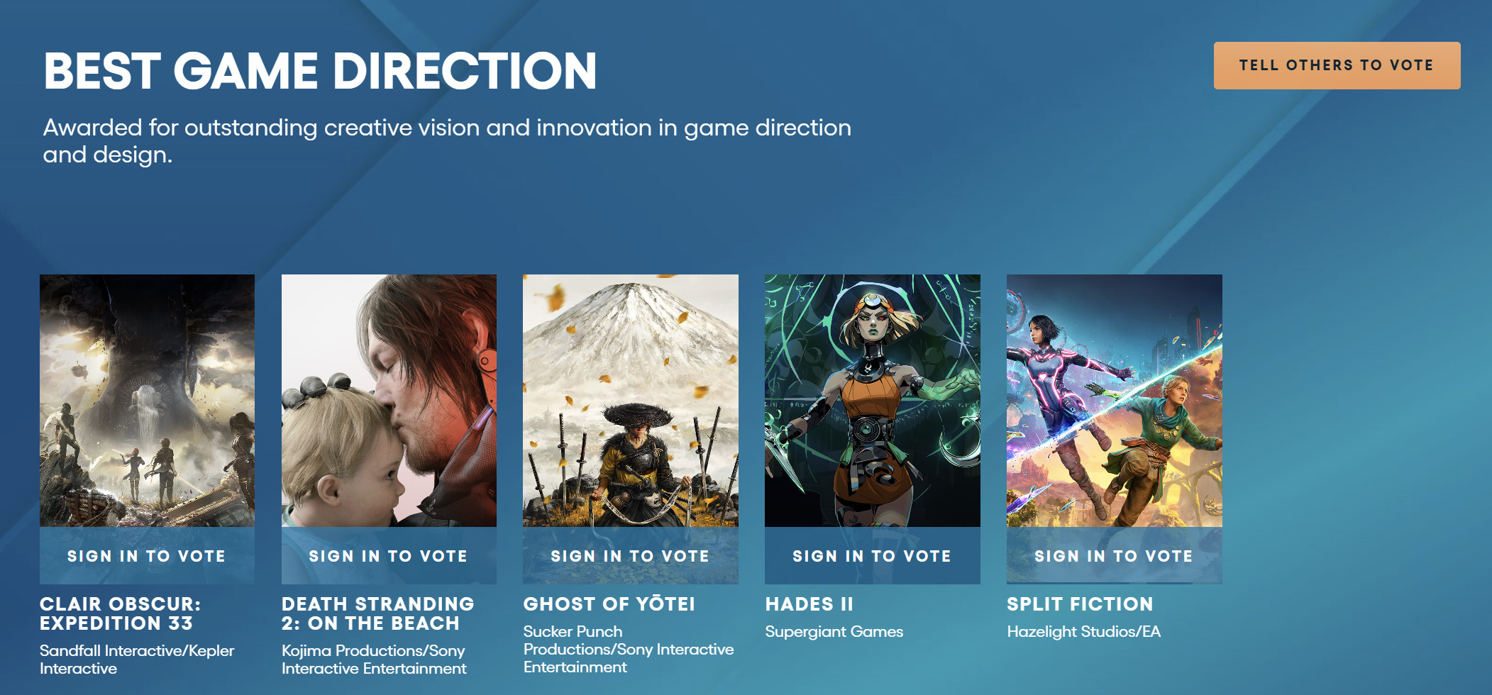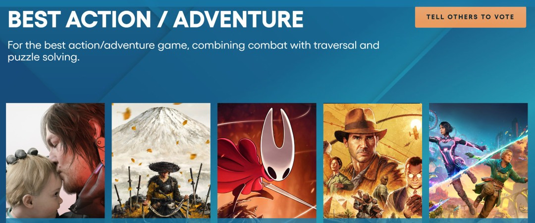 值得一提的是,《光与影:33号远征队》12项提名中有3项提名都来自表彰游戏中演员的表演,但即使去掉这三项提名,其获奖数量仍然超过了排名第二的《死亡搁浅2》和《羊蹄山之魂》。这两款游戏都获得了7项提名。