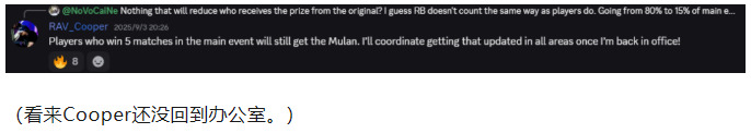 在之后的沟通中,官方人员Copper介绍比赛奖品因为人数变更发生了一定变化,但是正赛五胜玩家仍然会获得木兰赛卡,这点不会改变。
