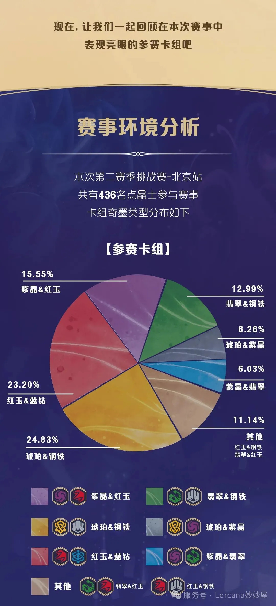 以上是洛卡纳官方整理的环境饼图,可以从图中看到黄灰出轮率极其惊人。红蓝、红紫和灰绿的表现也相当稳定。最后四强对局中也是这四套牌,洛卡纳当前的环境还是非常平衡且丰富的。(反观啊,反观。)