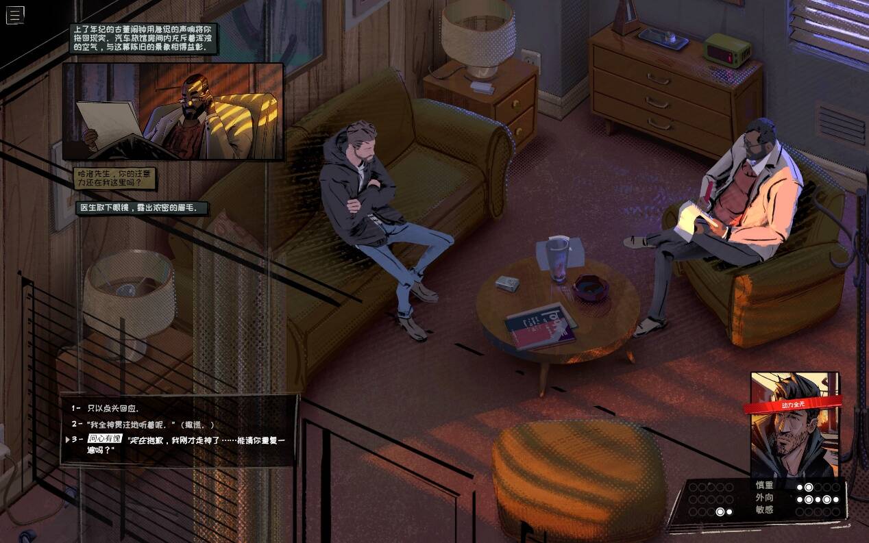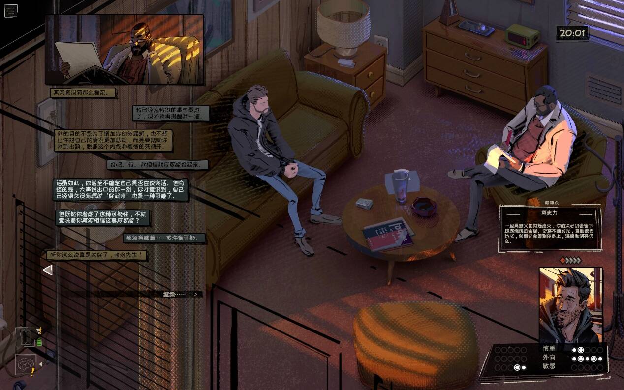 玩家通过探索环境获取灵感,并在完成重大事件后获取可重复消耗的“意志力”以推进调查。这些时间线索平行于角色的精神状态,形成了本作另一个维度的游戏性。
