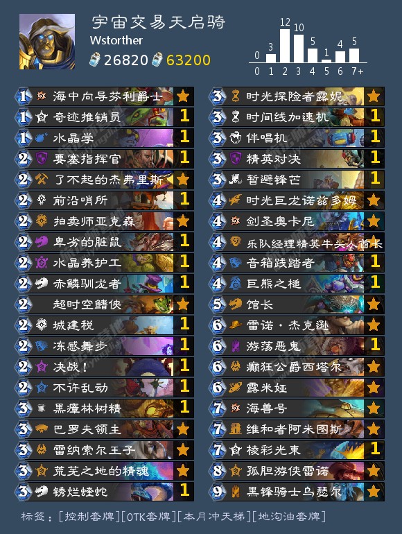 卡组的总体思路总体是一个快攻抗性还行、启动速度不快的otk,而且在厚度上也并不高。由于笔者maybe附体,当时玩着奥秘光环体系总容易鬼抽,经常抽不到组件斩杀,就索性放弃这两个本身不足以推死对面的体系(要推死可以去玩厕所骑),把精力放到天启体系本身(虽然破坏抗性可能会变差,但没了天启的宇宙骑本身就难打主流控制)。