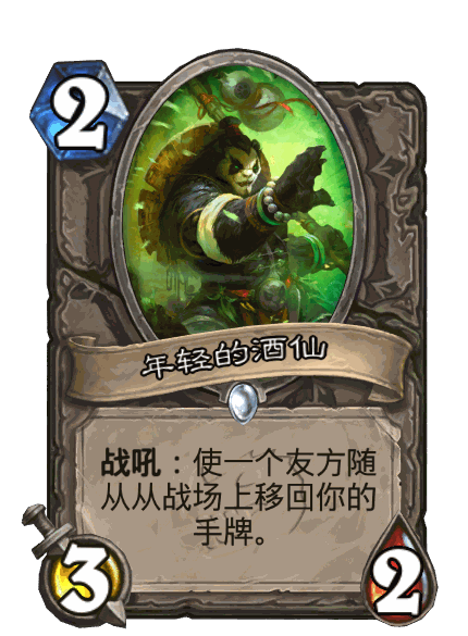- 能同回合使用三张战吼牌的情况下(一般是游侠将军希尔瓦娜斯+年轻的酒仙连招)可以将这张卡当作激活使用赚取1费