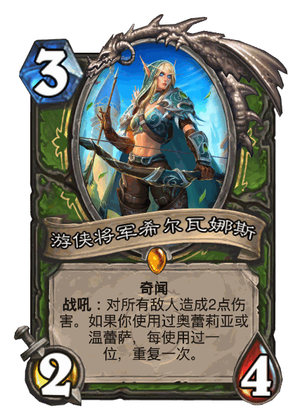 - 虽然看着平平无奇,但拥有1:2的费伤转换比,在卡组中仅次于触发特效的精确射击。与提前打开拼布好朋友的霍弗,叠满层数的游侠将军希尔瓦娜斯持平,是终结时的第一选择。