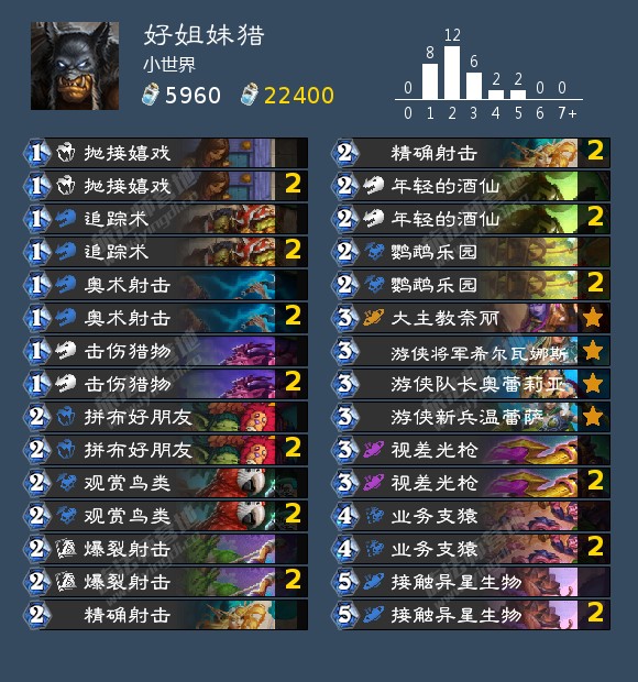 各位好,我是永恒狩猎丨小世界,本人一周前在营地发布了一套全新思路的卡组:箭雨猎(目前称为好姐妹猎),当时环境中猎人和萨满极多,这套卡组占尽内战优势,让本人以极高的胜率(31-9)和连胜数打进传说前100。这一周以来,环境变化,本人也进行了更多的测试和改良,如今将最新版本的好姐妹猎卡组构筑和理解分享给大家,祝大家上分之路更加顺利!