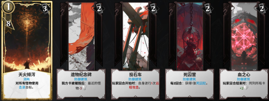 - 遗物纪念碑:我方卡被摧毁后,最近的怪物-3防御。总是有防御卡是需要抗在第一线的,能让怪物降低防御帮助很大。