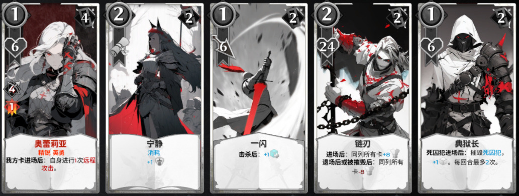 - 奥蕾莉亚:我方卡进场后,自身进行1次远程攻击。携带精锐和英勇(每有1点声望,加2远程攻击)词条。初始攻击不高,需要搭配辅助加伤害的卡和死囚犯铺场,才能快速养成,难度还是比较大的。