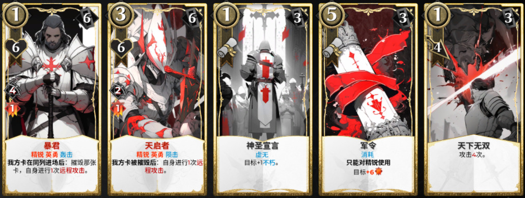 - 天启者:我方卡被摧毁后,自身进行1次远程攻击。除了精锐和英勇,这次多了陨击(远程攻击选定全场敌对卡牌)。前排部署大量的死囚犯,等和敌人近战攻击互殴被摧毁后,就可以触发多次全体攻击。缺点就是初始伤害偏低,一回合能交战和被摧毁的死囚犯有限,培养难度较大。