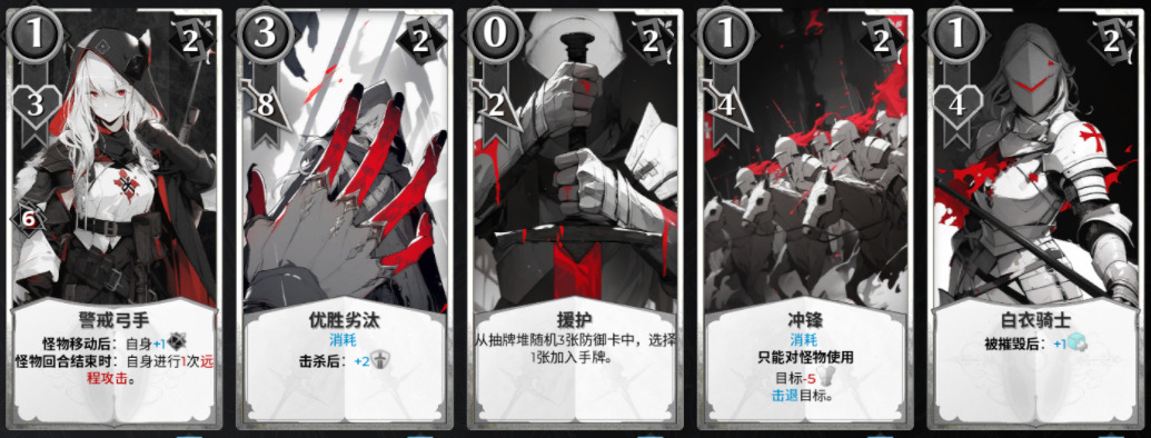 - 警戒弓手:怪物移动后,自身+1远程攻击,怪物回合结束时自身进行1次远程攻击。除了精锐卡以外的辅助输出角色,比起能远程攻击的防御建筑,有一定的成长性。