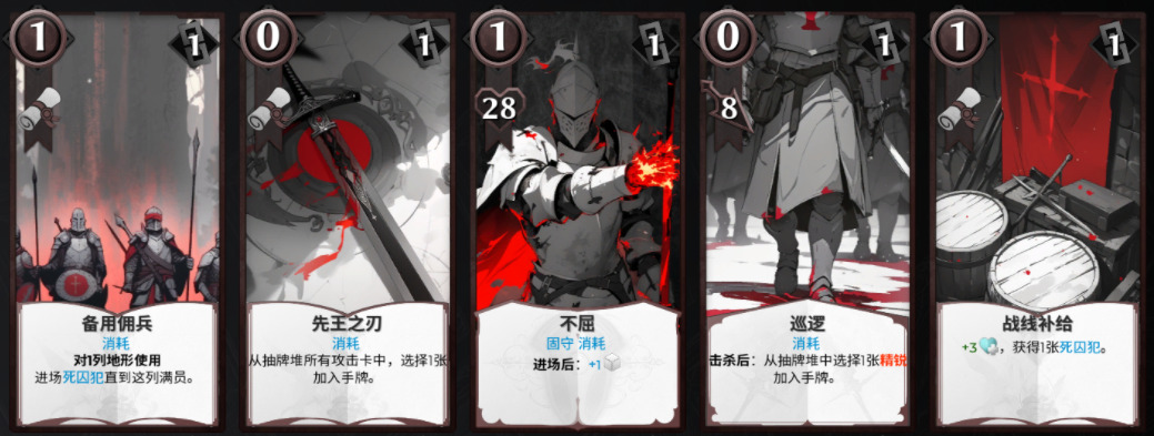 - 备用佣兵:在一列(最多5个空位)召唤死囚犯,携带消耗词条(卡牌使用后进入消耗牌堆),搭配精锐卡,1能量可以让精锐触发5次攻击。