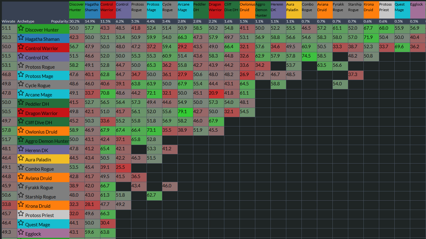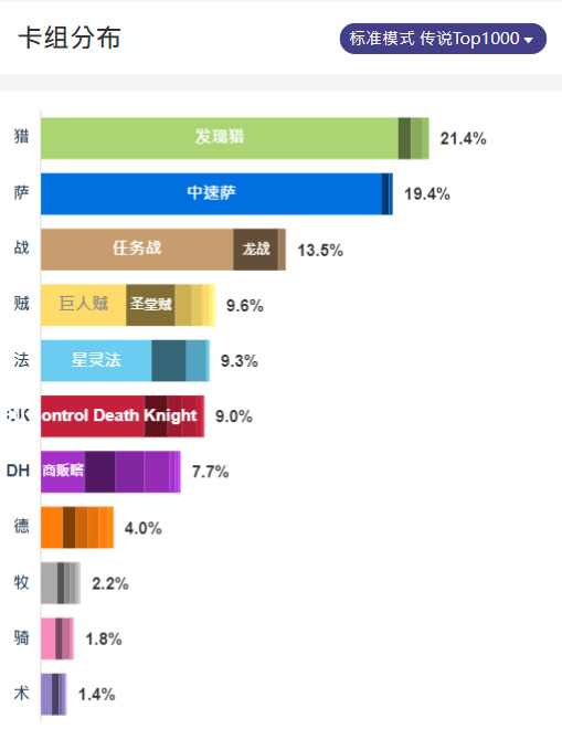 依序为: 发现猎/中速萨/控制战/红红绿DK/星灵贼/星灵法/火凤贼/奥术法/精魂瞎/龙战/跳水瞎/法强德/快攻瞎/赫雷恩DK/光环骑/连击贼/飞机德/火龙贼/星舰贼/克洛纳德/星灵牧/任务法/蛋术