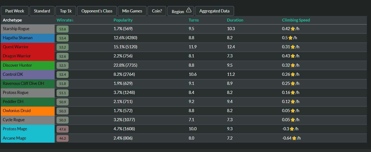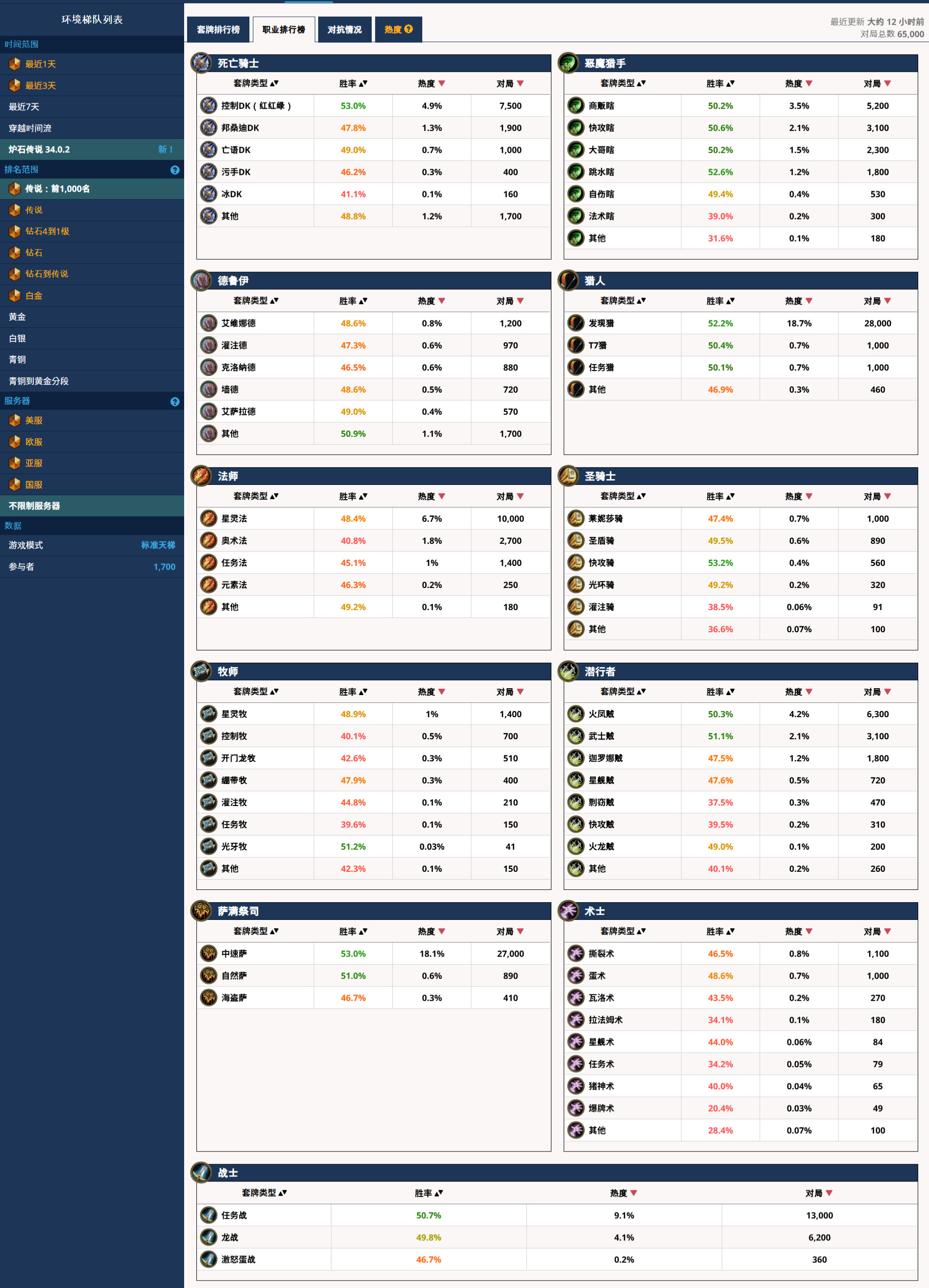 依序为: 星舰贼/中速萨/任务战/龙战/发现猎/红红绿DK/跳水瞎/星灵贼/精魂瞎/法强德/火凤贼/星灵法/奥术法