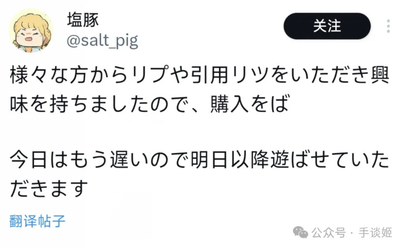 “因为收到了各位的转发和引用,让我对这个游戏产生了兴趣,所以打算入手。今天已经很晚了,大概会从明天开始玩。”