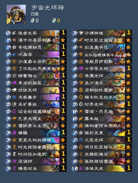 宇宙光环骑相比以往的宇宙骑更偏场面和节奏,椰子尊3回合光环的大节奏鲜有人可以招架。时光龙虽然带回来了,但其更像一张针对卡,不要像之前宇宙元气骑一样无脑硬拍。现在需要它的对局只有快攻,超展开,以及拿来锁德鲁伊的水晶。