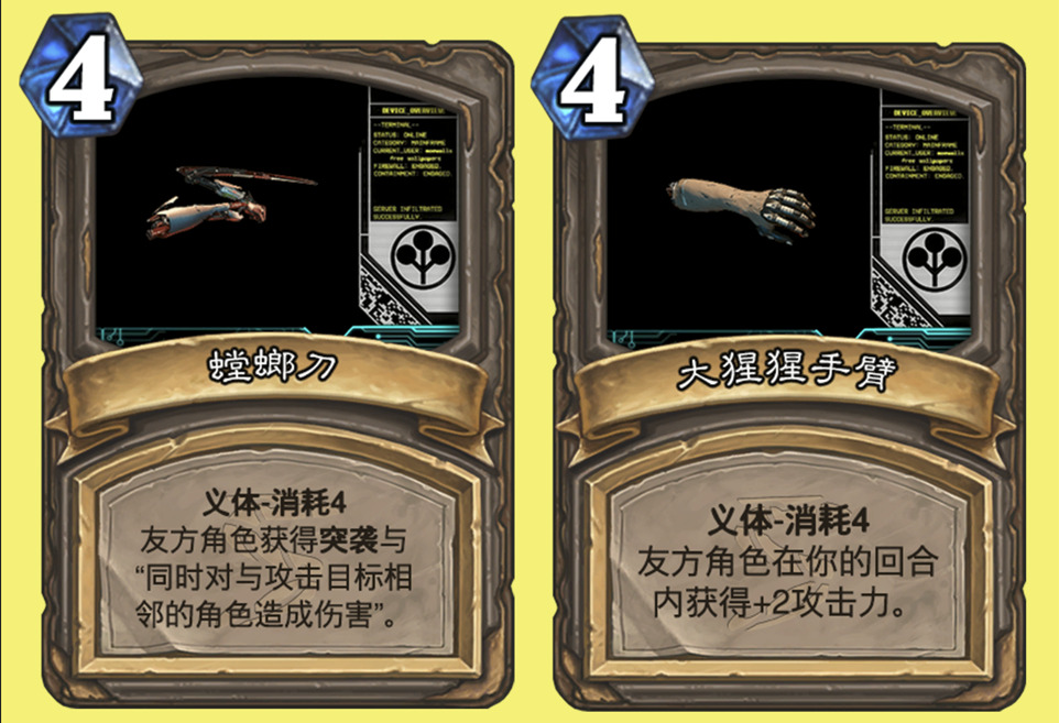 义体是一类特殊的衍生牌,分为5个等级,等级等同于其法力值消耗。当你使用(也可被称作“安装”)义体后,它们便会持续为你的英雄提供增益——但是要注意!每当你的回合开始时,你已安装的义体都会消耗RAM(消耗量等同于等级),如果RAM不够它们便会失效——不退还!