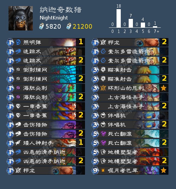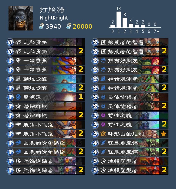 在营地前人卡组基础上修改的进攻型奥秘猎,尽可能去避免“一通奥秘干扰完,等于场面放个屁”的构筑陷阱,采用“场面为主,奥秘为辅”的节奏猎思路。奥秘的携带非常有说法,可以自行体会,贴主全程用此卡组9星钻3打到钻1三星(然后被系统天谴了,三次渡劫失败),卡组意外地适合特定环境,对局较为极端化,小样本数据可参考(按胜率高低):