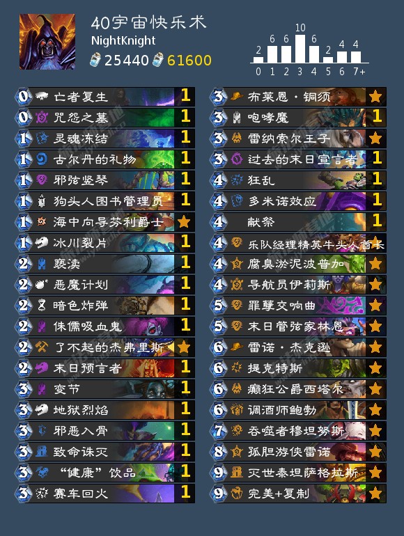 快乐术的艰难复兴hhh,操作下来发现纯快乐术实在顶不住现在的狂野马速,偶然间意识到宇宙卡牌可以有效弥补快乐术的解场和回血短板,遂尝试了宇宙快乐术(其实就是宇宙撕牌术+传统快乐组件,问我为什么不直接玩宇宙撕牌术,哎就是喜欢快乐233)。