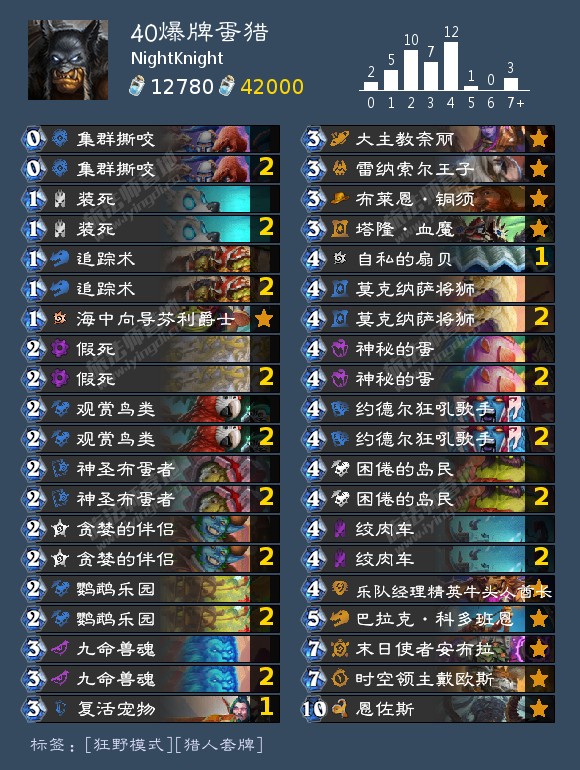 野兽选择了4突袭,2冲锋,1嘲讽的配置,强调主动进攻,野兽之间略有小配合;特别注意穆克拉先生(常常被神秘的蛋减到3费出)经常还有爆牌奇效,不要忽略。