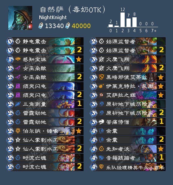 OTK方式:上回合2须臾闪电,或者上回合风潮+须臾闪电,或者上回合须臾闪电+本回合艾萨拉之辉,三选一都可减费自然法术(特指女巫杂酿)到0费,然后不断女巫杂酿奶黑暗邪使艾蒂丝打3,一般6费左右可以完成,手速快斩杀线可到30-60。