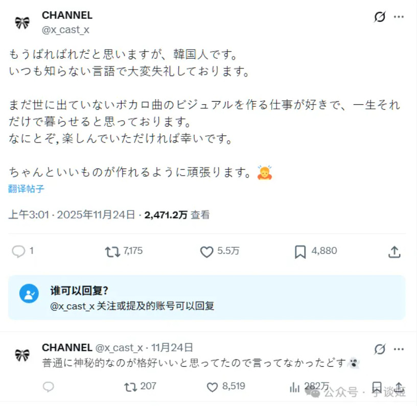 身份被曝光后,channel立刻把自己的属地显示切换成大洲范围。但由于发现这一事实的人实在太多了,在纸包不住火的情况下,channel在推特上发文,坦诚承认了自己作为韩国人却一直坚持用日语发推的“迷惑行为”。