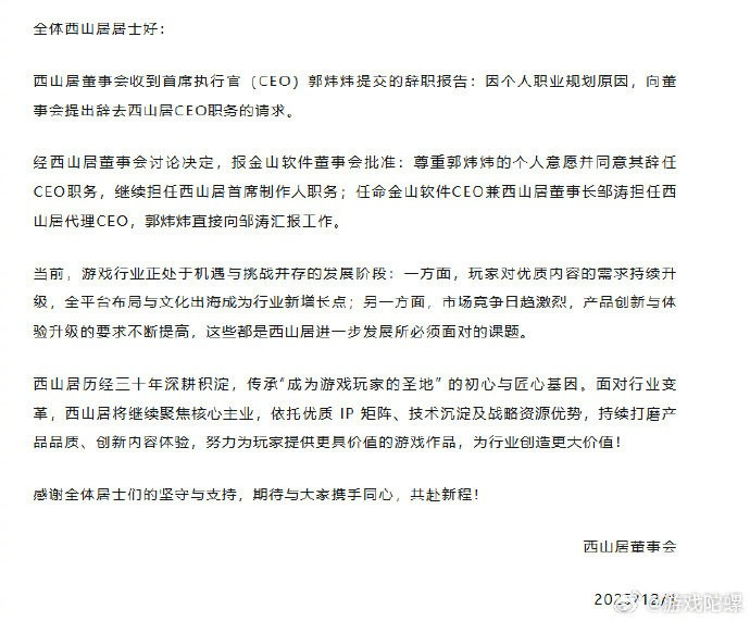 近日西山居发布董事会公告,确认知名游戏制作人郭炜炜因个人职业规划,申请辞去西山居CEO职务并获批准。