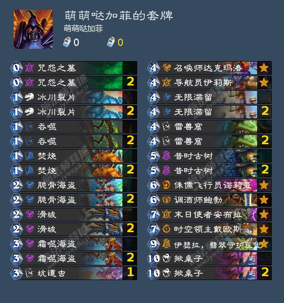 自研地沟油,胜率55%左右,用的是大德术的底子。起手留坑道虫、掀桌和过牌组件,用地标和脆骨死5个亡语随从,获胜方式:戴欧斯+安布拉、游客+安布拉、无限滞留冻脸过墙,巨人压死对面。大家有建议可以再提一下