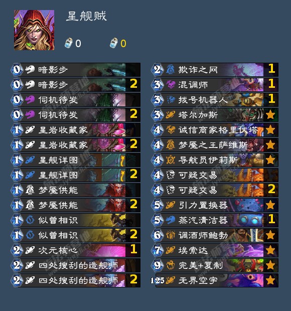 事实上笔者认为现在最强的贼是星舰贼,笔者在国服前百分段20余场有76%的胜率,目前大数据前1k分段276场也有56%的胜率,整个套牌十分全面,什么都能打。但需要对环境套牌有一定的了解,毕竟有很大一部分强度来自于4张1费偷牌(写到这忍不住笑出声)。