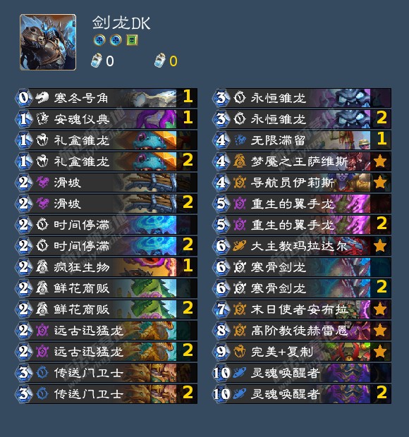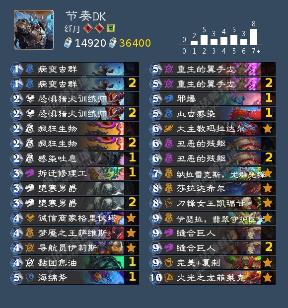 节奏DK仍然是最强的DK形态,甚至在环境中也能和大多卡组比划比划。并且他没有任何一张新卡,笔者推荐来自纤月的节奏DK,特点是选择携带了拆地标、焦油、女王、火龙。女王的全体A3和资源比无头更适合当前环境。