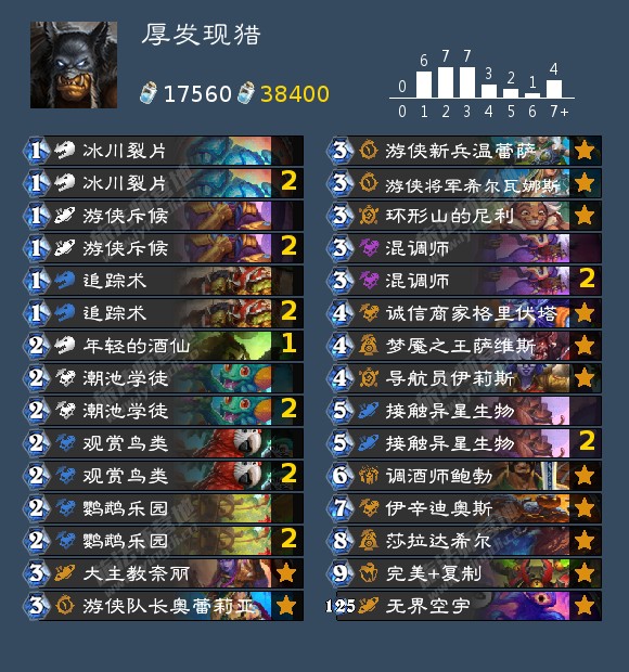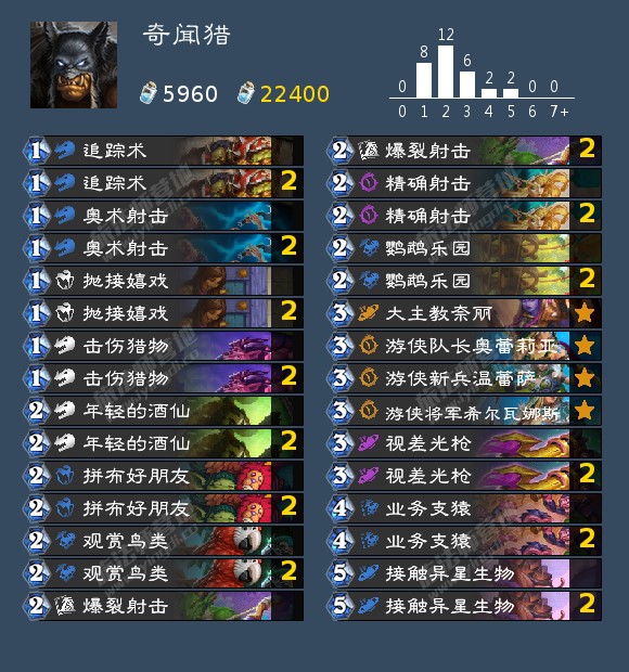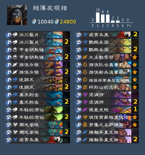 猎人甚至还有选择——最近兴起,亚服登顶的任务猎,这套牌抗快能力略差,害怕前期爆发和后期绝对质量,主要擅长在前中期爆发(5费任务奖励/6费游侠斥候+任务奖励是非常强大的资源)