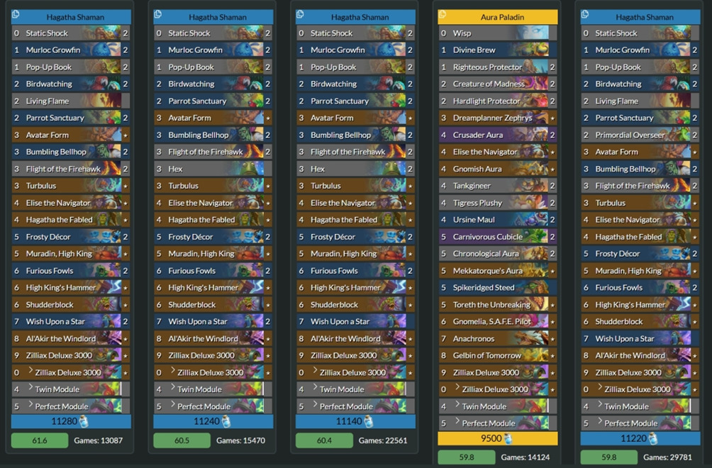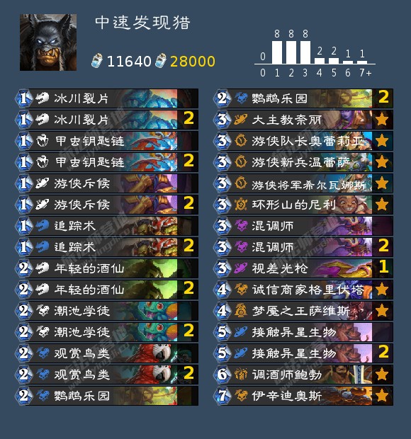 发现猎和中速萨仿佛是为数不多的完全体卡组。其中发现猎有些克制萨满,这让天梯一度被发现猎统治。但发现猎需要练习成本,所以更好上手的中速萨才是版本热门,钻石到传说分段达到12800场次使用的套牌里,胜率前5有4套是中速萨。
