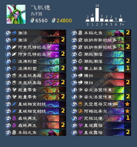 飞机德很意外的成为了最强的德鲁伊,在有了4张稳定抽随从后,德鲁伊几乎稳定可以在4费前打出天空慈母艾维娜,很多时候甚至是5-10的。而偏慢的环境让飞机德有足够大的发挥空间,即使随机的传说牌没有特效,在5/6费打出几个白板大哥也是很有威力的。