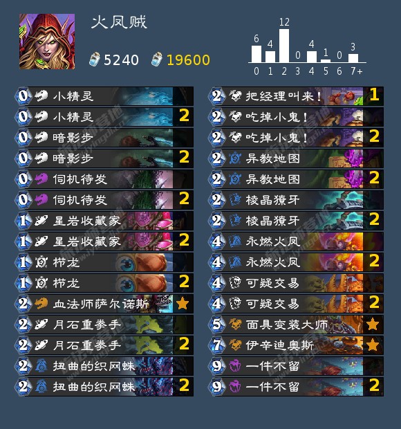 把发现猎推下王座的就有星灵贼很大的功劳,这个慢腾腾的爆发卡组恰好抓住猎人回血不足、无法解决巨人的缺点狠狠吃猎人分,直接把天梯里的猎人逼的改变了形态。但随着猎人退去,经常卡手、害怕快攻的星灵贼也随之退去。火凤贼已经被砍了无数次了,很难想象他又站在我们面前。但事实是前期的爆发展开是目前环境许多卡组无法应对的。