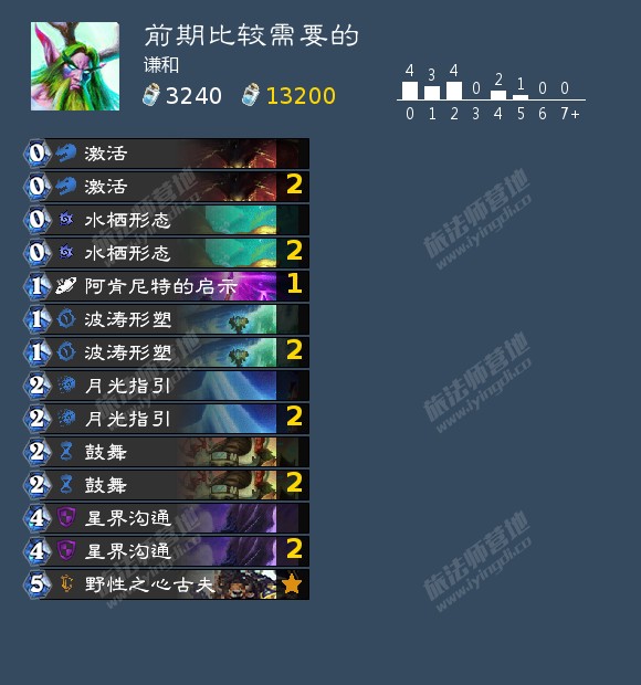 再说些前期的小打法吧,水栖会被波涛影响,这时就需要具体问题具体分析了。一般最佳水栖费用是2费或4费,但如果手牌同时有水栖,波涛和2费要打的牌,可以考虑直接开水栖,但如果找不到1和0或者星界,代价就是少抽一张牌。也可以1费空过等到后面再去开水栖,再开波涛。主要取决于你面对的对局节奏是否急迫。除非不这么做就会输了否则不推荐赌已经排好两张底牌的水栖,只有一张未知概率很低,这种时候的水栖更多用于控顶。这些同样适用于双水栖的情况。