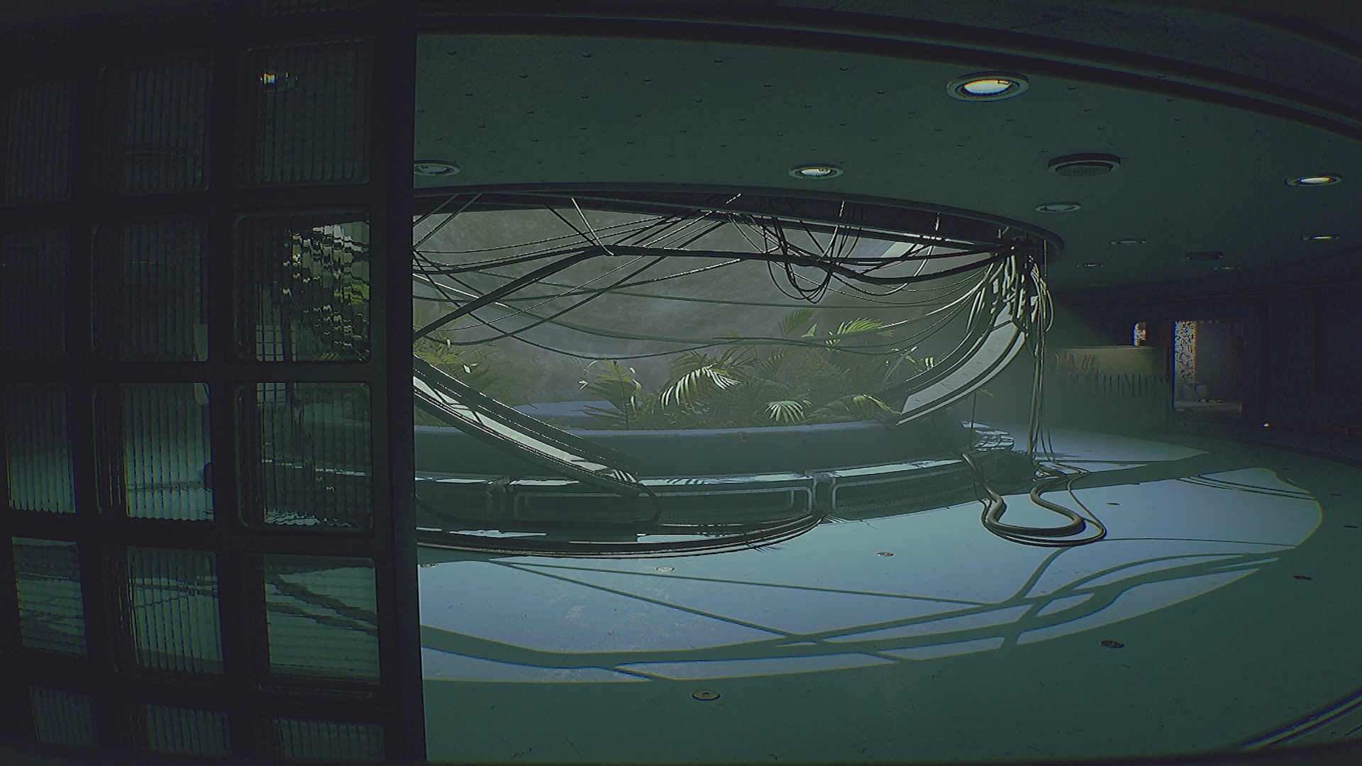 一路走到长廊尽头,月亮冷清的光逐渐通过窗户照了进来,照在无法坐下的长椅旁。我听着背景平稳的旁白,望了一会这颗巨大的行星尸体所反射的光芒,其照亮了一座仍维持形体、却早已失去生命的文明遗迹。随即,在旁边的房间里获得了关键道具,一把CAT,似乎是一把多功能的工程器械。几乎没有提示,倒也合理,这一类型的游戏通常借由撤除指示,让玩家主动承担意义生产的负担。这负担的结果,就是我花了十几分钟,才摸清了如何使用这把CAT开始解谜,并与它共同攻克了后续的许多难题。当从符号理解到动作理解的负荷被不断抬高时,游戏的叙事就会变成身体性的,在《月球任务》中,这种身体性即是制造玩家焦虑的源头。据开发者所言,这把工具起初是作为武器使用的,而后来他们改变了想法,将其作为了纯粹的工具。某种意义上我会赞同这样的改动,但是后面无法消灭05号机器时,我反过来痛恨这个改动。