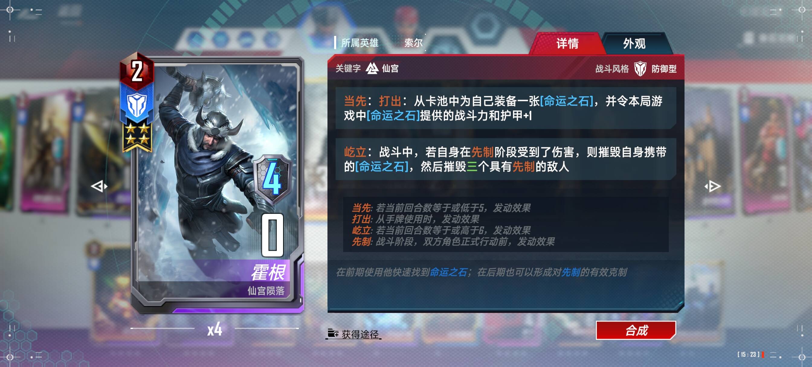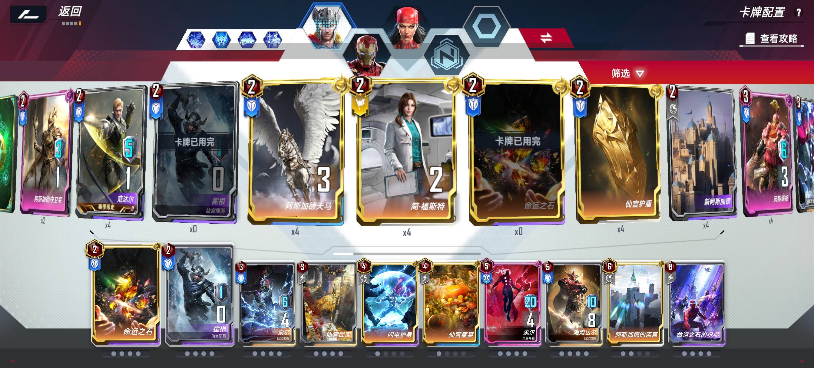 1、前4回合战力拉满,一定要拿到至少1张仙宫武库,前期命石不多的情况下,索尔不要带命石,留给海姆达尔