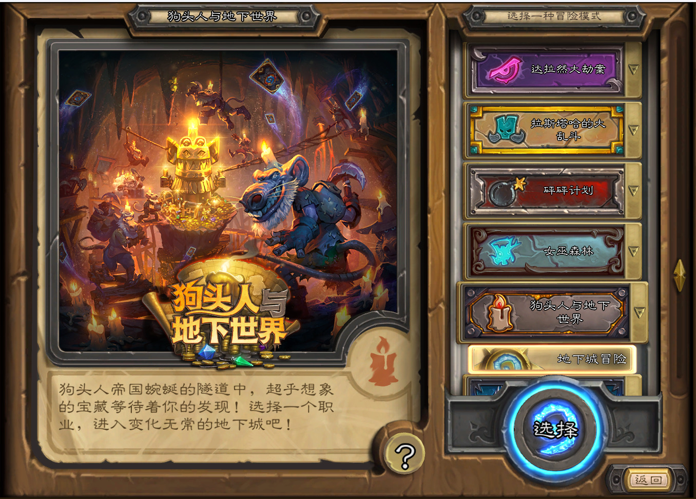 要说到我最早接触到的带有可重复游玩性的PvE卡牌玩法,应该就是《炉石传说》冒险模式中的狗头人与地下世界了,还记得当时第一次接触到这类卡牌肉鸽玩法,茶余饭后都忍不住想要去狗头人地下城玩一遭,最后被各种奇怪的进化冲锋等等的Boss打回老家。后续炉石也陆续推出了女巫森林、拉斯塔哈大乱斗、达拉然大劫案、古墓惊魂等等的全新冒险模式,相较于最初版本的狗头人与地下城,新的冒险模式有着更丰富的英雄甚至技能的选择,也带来了更多宝藏强化选项以及强力专属卡牌,对手也变得更加五花八门千奇百怪,只是好景不长,在推出古墓惊魂后暴雪便对冒险模式这一花费与收益不成正比的玩法失去了兴趣,至此炉石中充满随机性与养成性且可以随时开始或暂停的PvE玩法就止步于此了