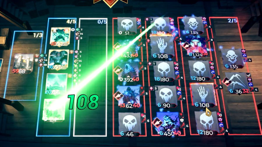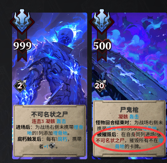 另外还有个Boss因为自身存在二阶段,一阶段死了会在原地复生出二阶段的形态,但是没想到我的卡牌自带前进的能力效果 ,可以占领前方的地块,导致Boss二阶段被挤掉了出生点, 最后难产没出现在战场中让我跳过了二阶段,很难绷但是好像又符合结算,因为这游戏的复生也是和炉石一样结算顺序非常靠后,这个游戏里有着很多交互结果能让我想到之前在炉石中遇到的一些结算以及打牌思路,估计制作组也是有参考过这方面的设计逻辑的。得益于此,让我刚入手这个游戏的时候就有点看到了故人的感觉。