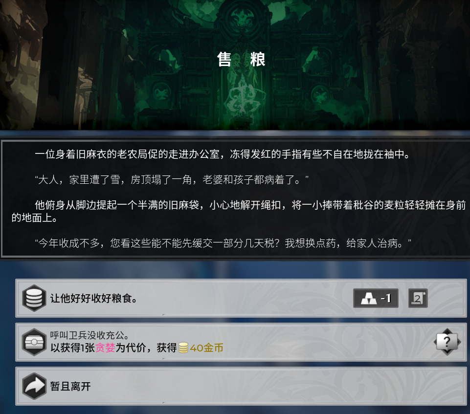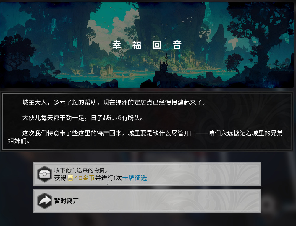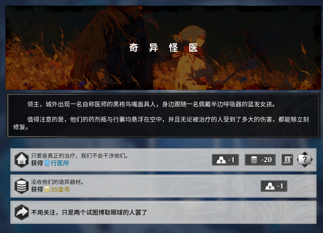 和别的游戏一样,部分事件也是伴随着后续内容的,一般是不会让玩家白白做出牺牲的,大部分时候玩家做出善事后续都会迎来报恩事件,以游戏的角度来看的话就是在前期进行一定的投资,虽然前期变得更困难,但是后期却会因为奖励事件更简单,不考虑事件人心等等的想法的话,玩家可以依照自身牌组节奏选择事件选项,比如前期牌组可以牺牲部分前期加强下薄弱的后期,后期牌组就在前期拿到更多资源等等的。一些事件还有着拼点的判定阶段,玩家可以单纯依靠运气,也可以使用道具改换点数,进行一定人情世故的操作,获取更高一级的报酬。