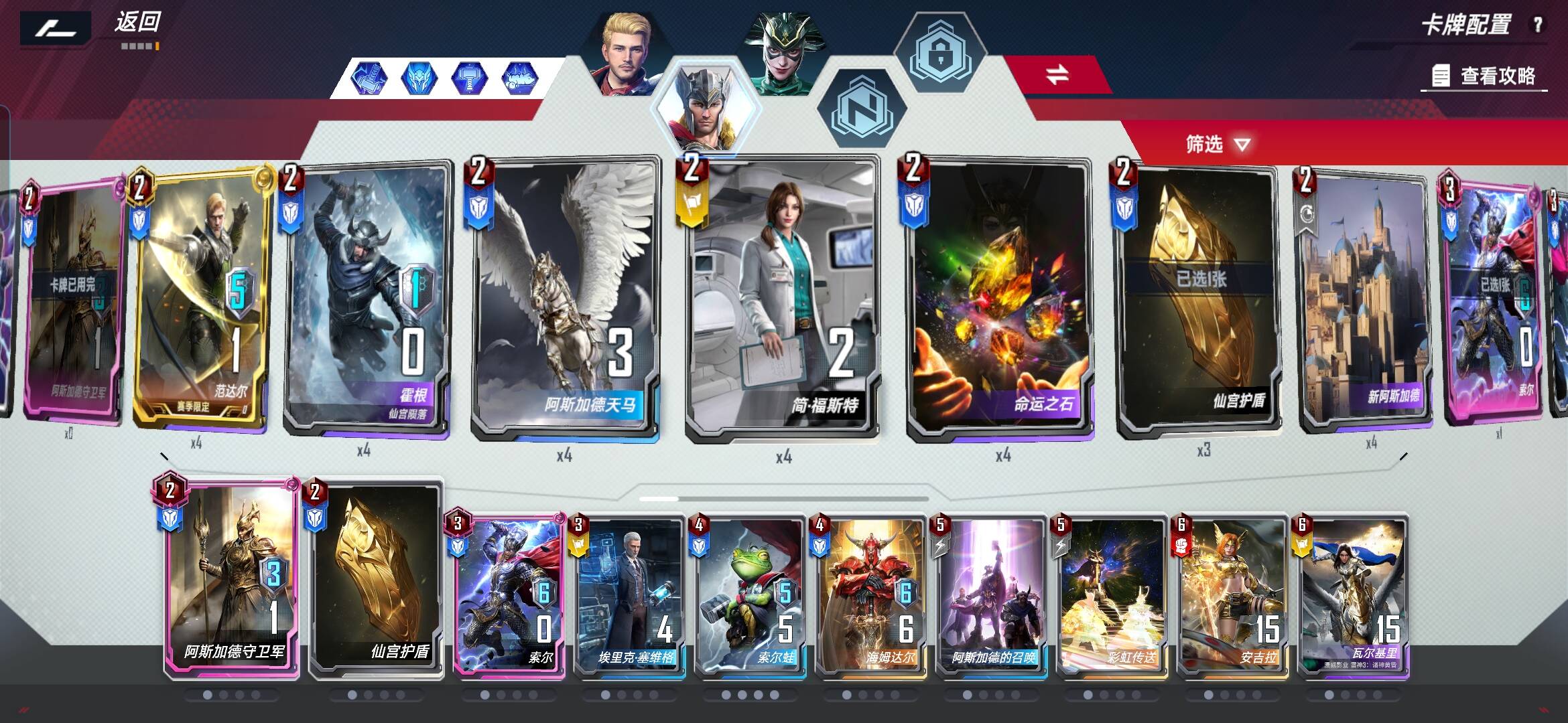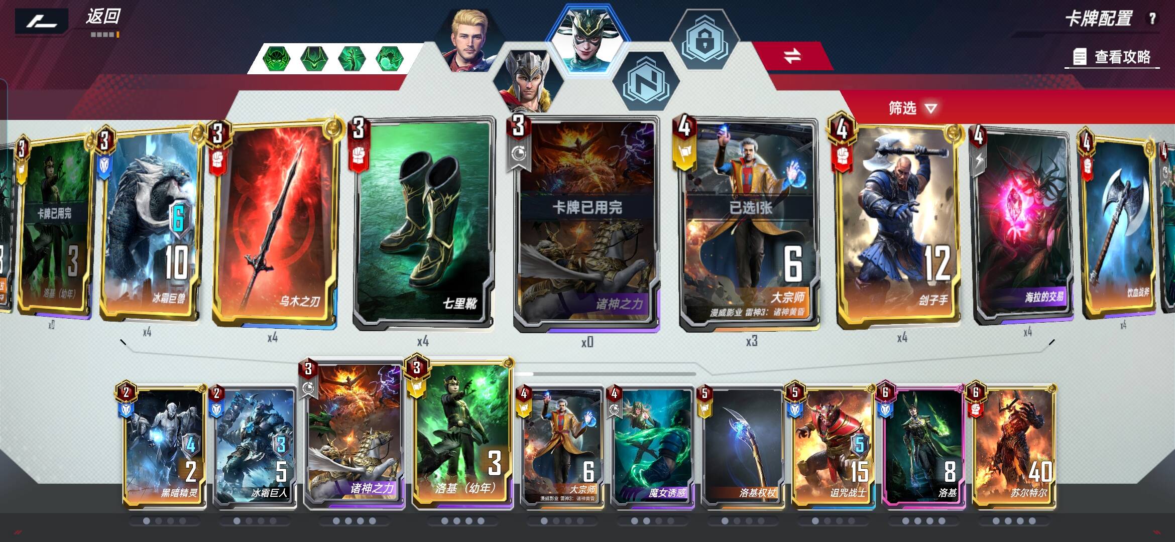 三回合三本,等一回合看看有没有小洛基,黑暗精灵,索尔,有小洛基,索尔基本稳了,能拿到诸神之力更好,拿不到无所谓,然后升四本,集齐以下班底即可: