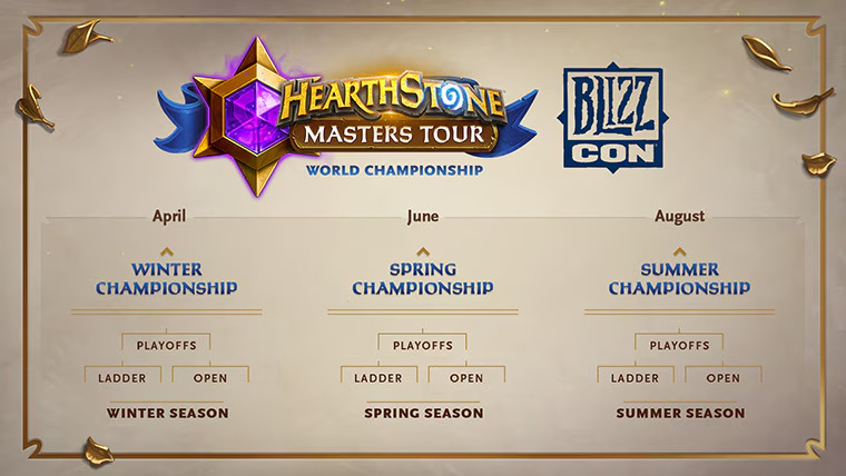 明年全球炉石电竞赛事体系(以下简称外服) 的赛季数量将从春、夏两季加上特殊的最终季,恢复到冬、春、夏三个正式赛季。每个赛季结构相同,都还是各持续2个月,现有的季赛锦标赛、季后赛、公开资格赛都还会有,再加上一种新的基层选拔。