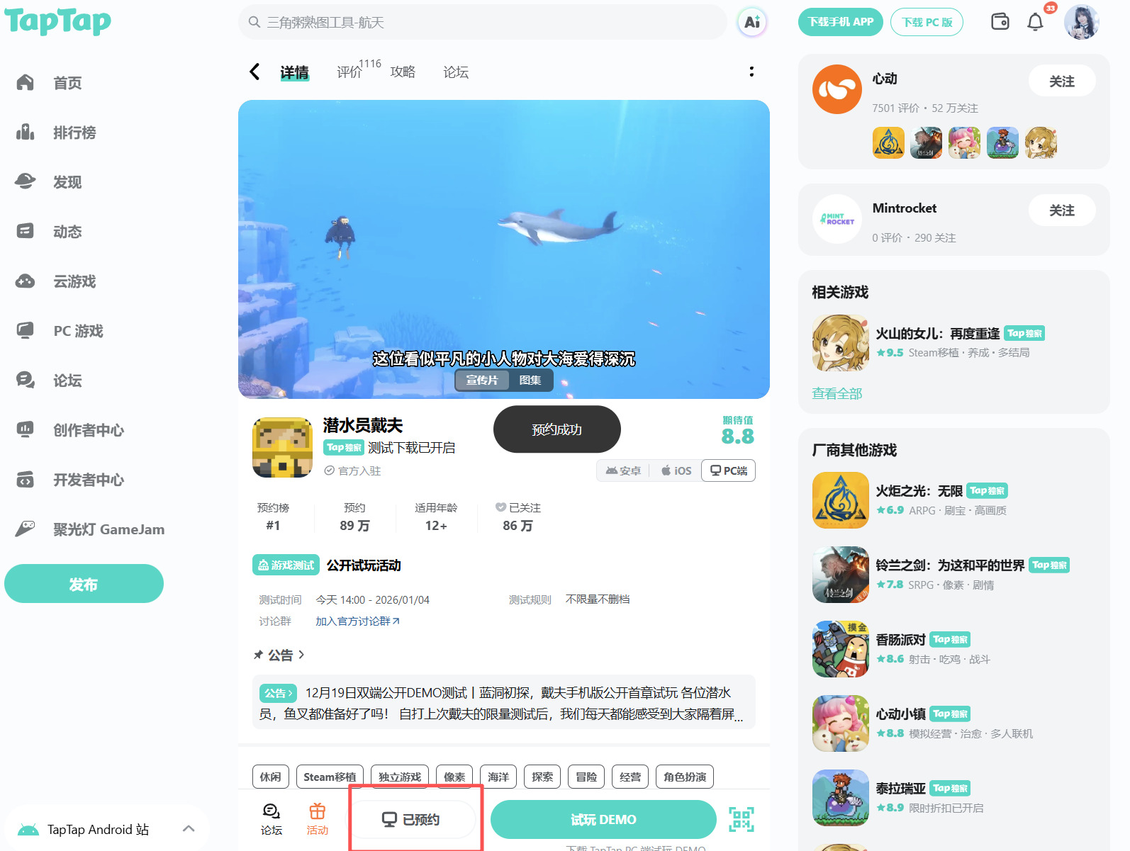 与此同时,TapTap预约里程碑已经全面开启,Steam价值36元的音乐&设定集,手机版预约游戏就能免费获取,还能解锁更多TapTap联动独家奖励,测试期间参与试玩还有额外神秘纪念道具,还在等什么?一同踏入随时下潜的蓝洞之旅吧!