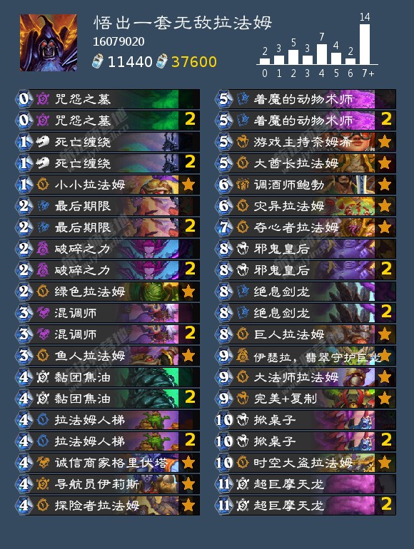 本人轻度玩家,月末研究地沟油,组了这套拉法姆,发现相比现有拉法姆强度还挺高,基本上除了星灵法少有劣势对局,打战士更是未尝一败,分享给大家,希望能提供改进意见