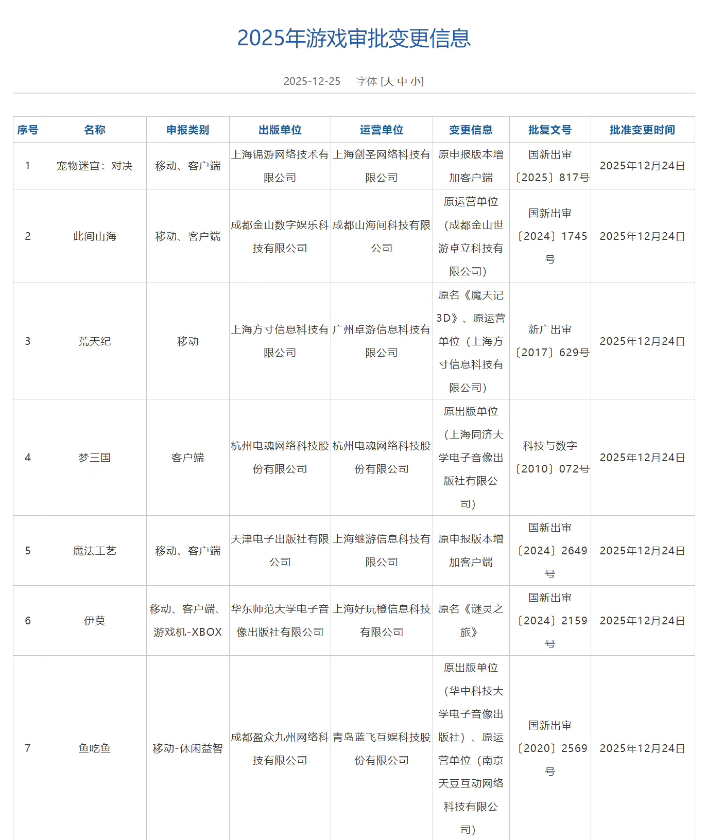 游戏审批变更信息方面,12 月有 7 款游戏过审,包括《宠物迷宫:对决》客户端版本等。