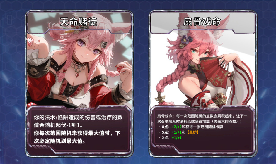 例如:狐仙就是以随机数作为主要特色的英雄,需要搭配拥有随机数相关效果的卡牌。