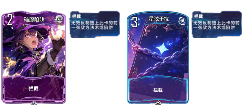 反制链期间战场时间暂停,双方轮流出牌,直到无牌可出。而拦截词条可以无效反制链的上一张卡。