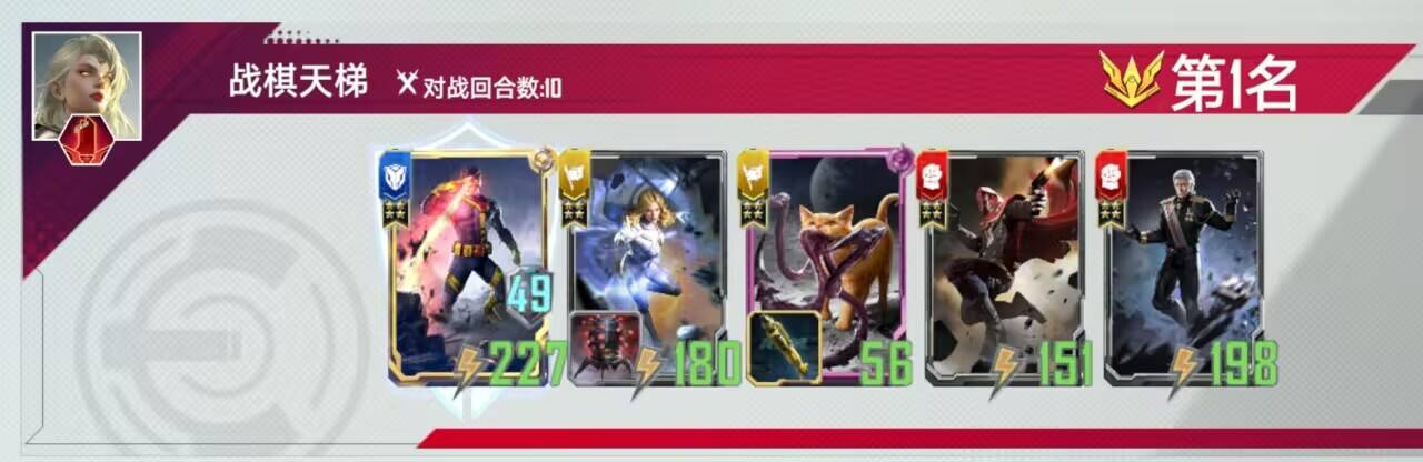 之后的事情没啥需要多说的,5本遇到白皇后万磁王托尼异界猫这4张直接拿。白皇后拿到第一张以后剩下的可以先不拿缓缓,这玩意有点贵;托尼容易出现2+1等不到第四张但又卡住位置不得不卖掉的情况,虽然不舍但是没办法不要硬等;万磁王理论上2+1养着最快但因为位置很挤所以真2+1了一般是2放场上1放手里等4;异界猫看当前对手,明确当前对手没有高额技能伤的话可以先缓缓。在拿到异界猫后,遇到能量操控直接买了打给异界猫。另外蟾蜍飞跃拿了打给雷光眼,这个优先级是最高的。