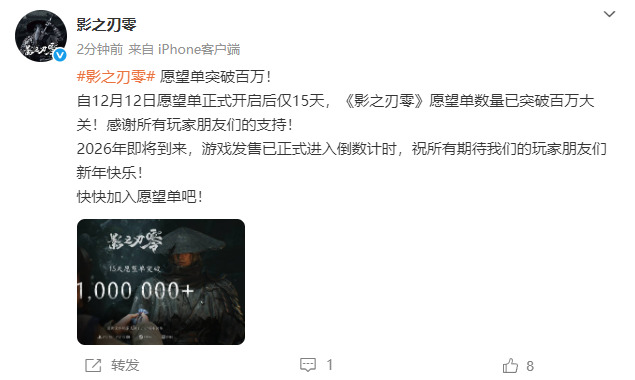 15天破百万!《影之刃零》100万愿望单数量达成!