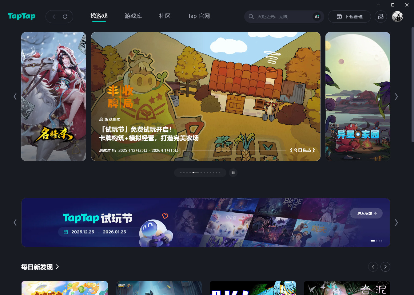 本次“Taptap试玩节”是 TapTap 为广大玩家精心打造的多日新游限时试玩活动,活动期间,玩家可在PC端专属页面下载试玩《丰收牌局》的最新测试版本哦~