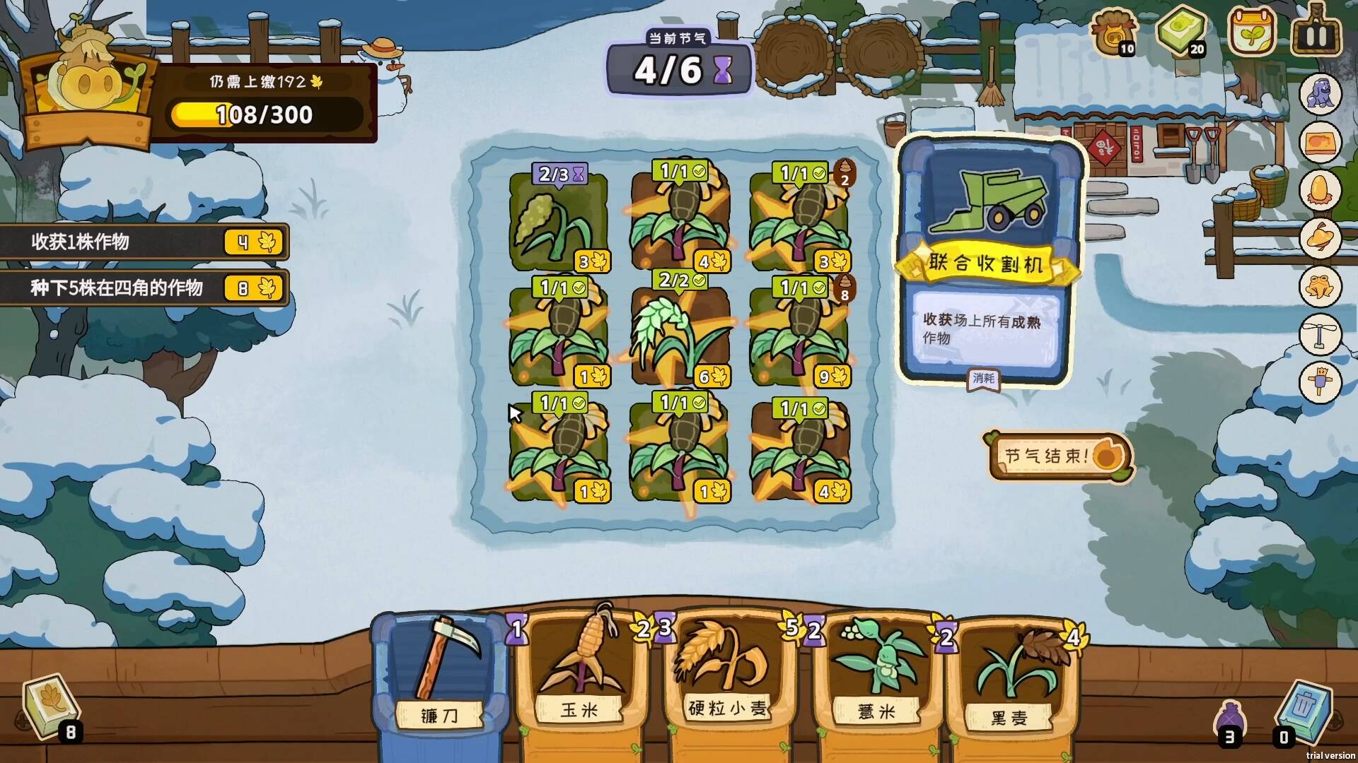 《丰收牌局》是一款模拟种田的卡牌肉鸽游戏,在一个季节轮回的丰收世界里,每一个抉择都至关重要!你要在有限的时间和空间里,精心播种各式种子,收获丰厚的作物,赚取巨额财富!别忘了时刻关注你的仓库,灵活调整牌组构筑,巧妙选择遗物,助你成为无与伦比的农场主!
