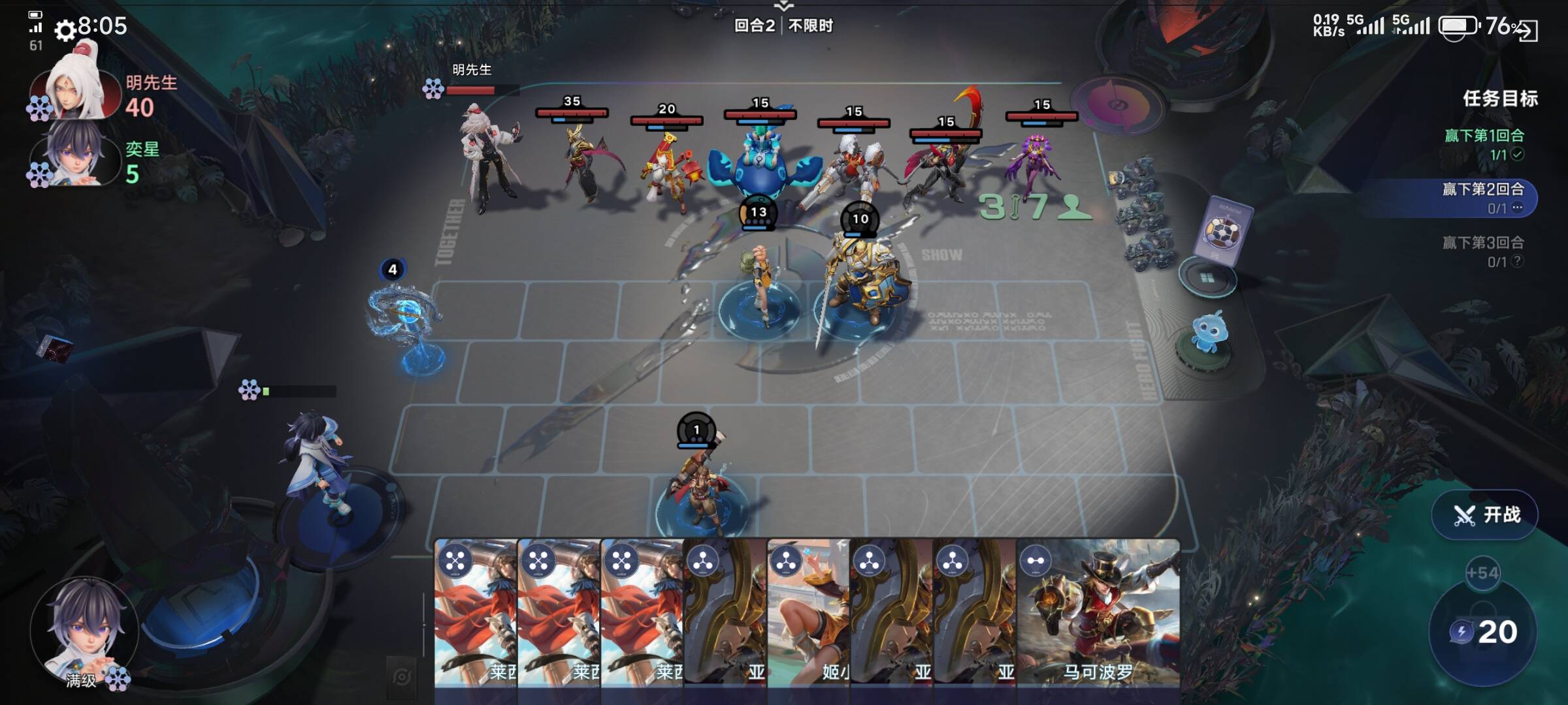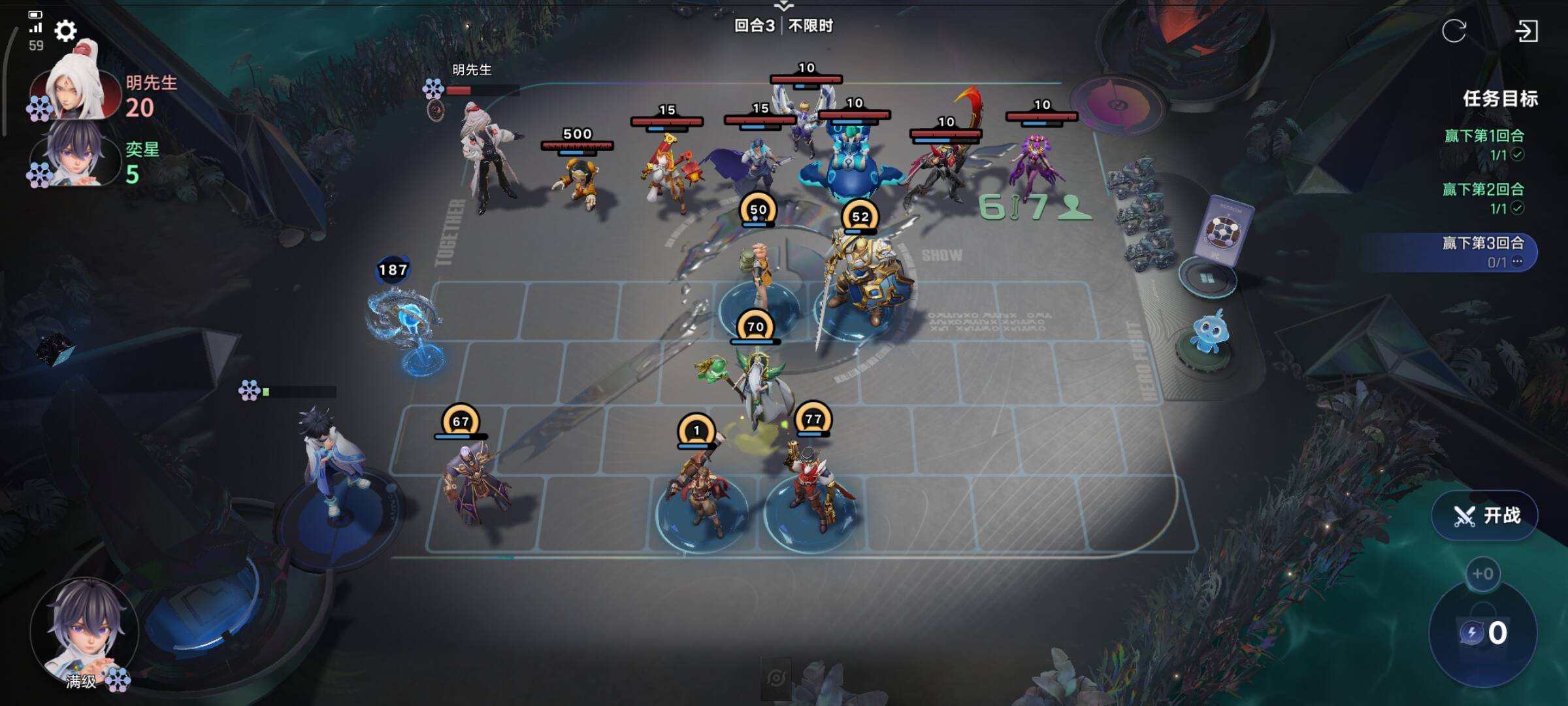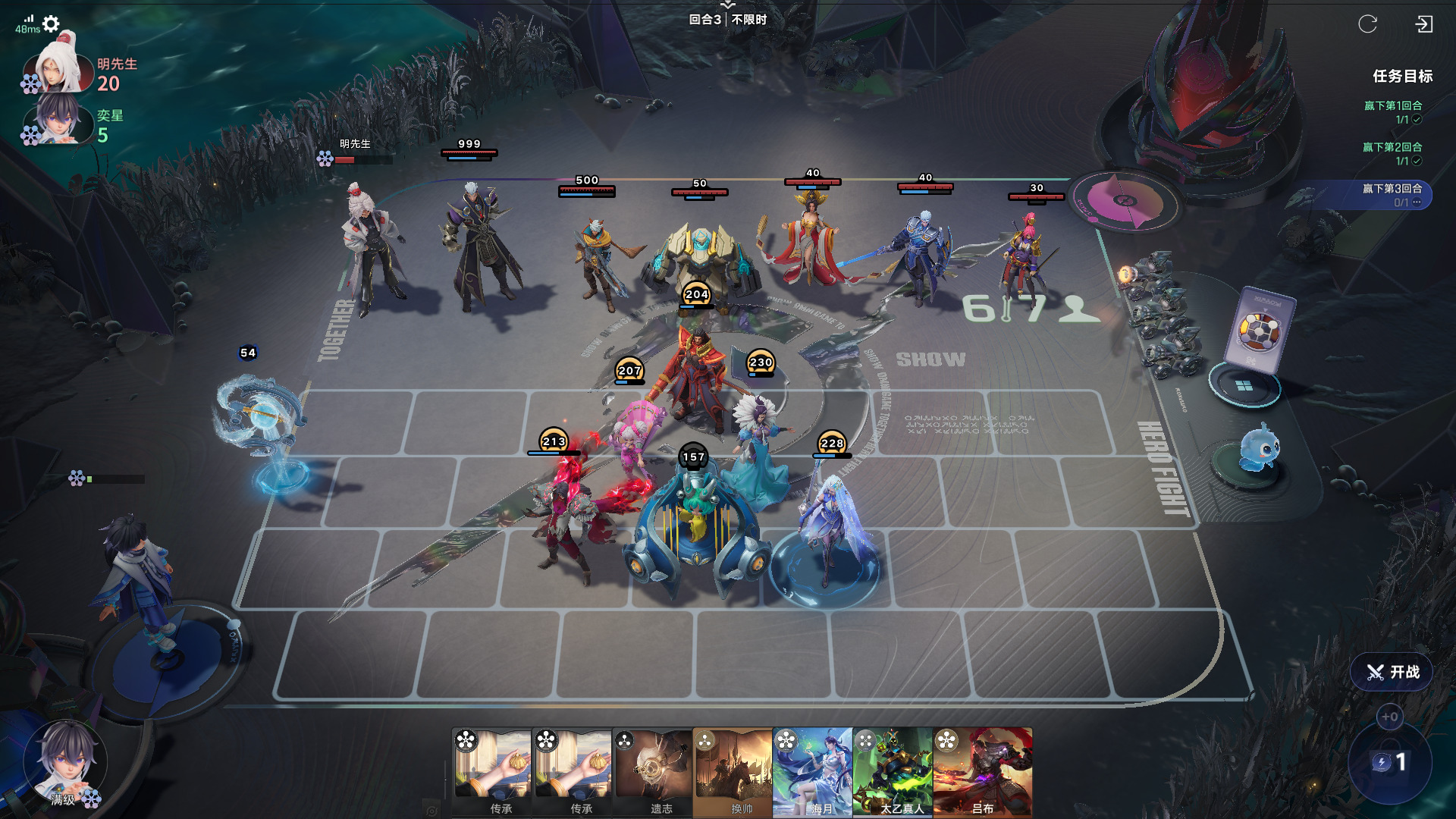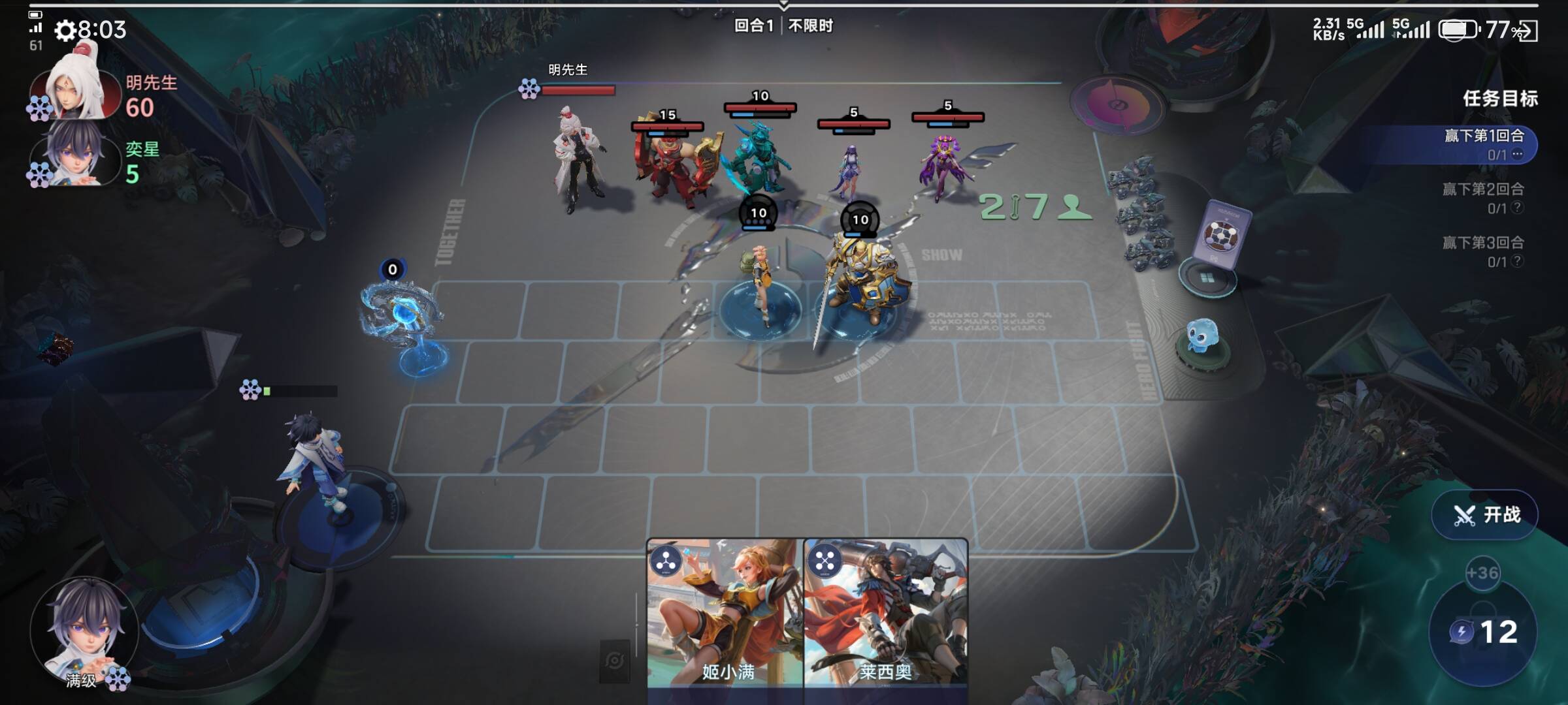 来到第二回合,商店里的姬小满、莱西奥和亚瑟,看到就买,马可波罗是顺带买来输出的。在买够3张亚瑟之后,先觉醒亚瑟,然后是莱西奥,最后是姬小满。